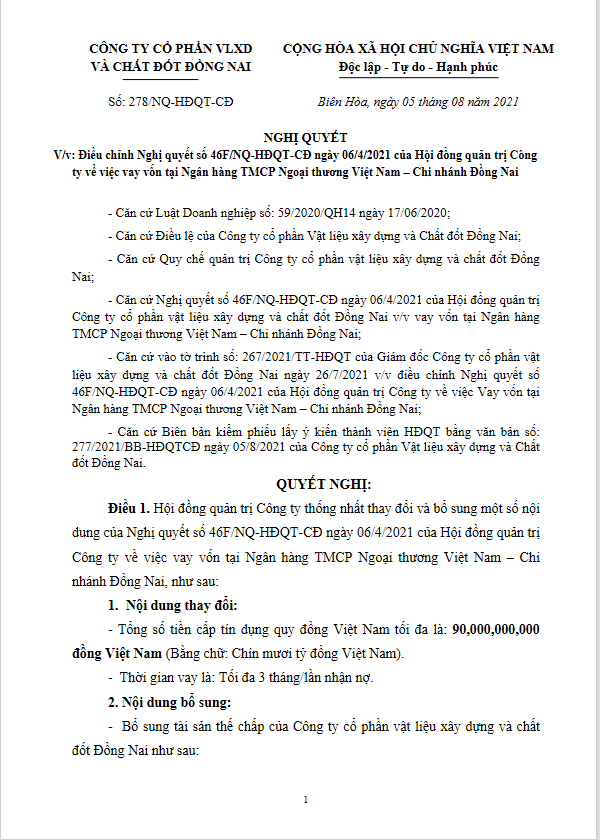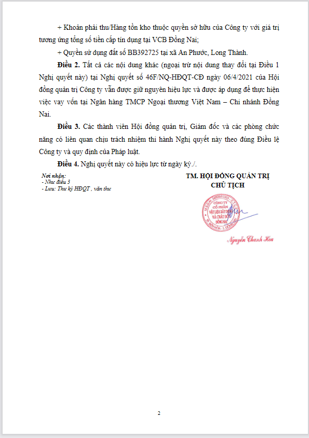CBTT_ Nghị quyết HĐQT điều chỉnh Nghị quyết 46F/NQ-HĐQT-CĐ ngày 06/4/2021 v/v vay vốn NH Ngoại thương Việt Nam.